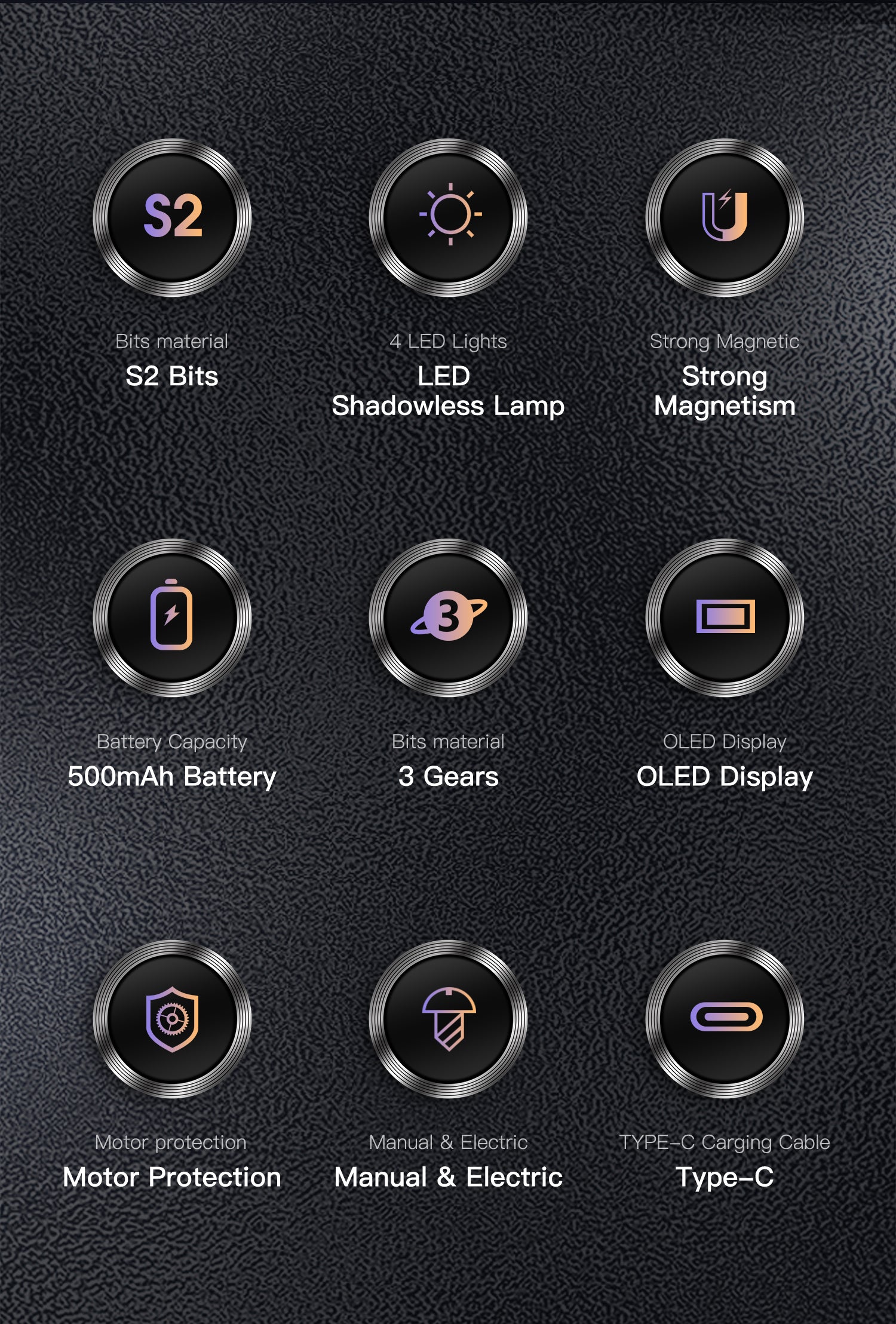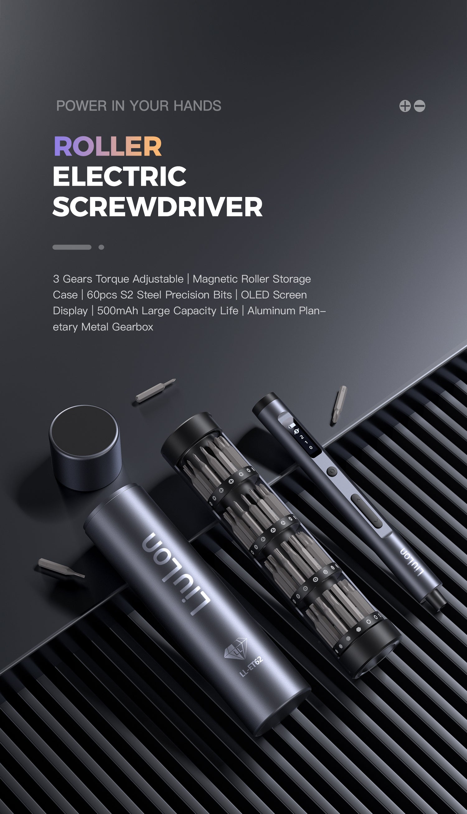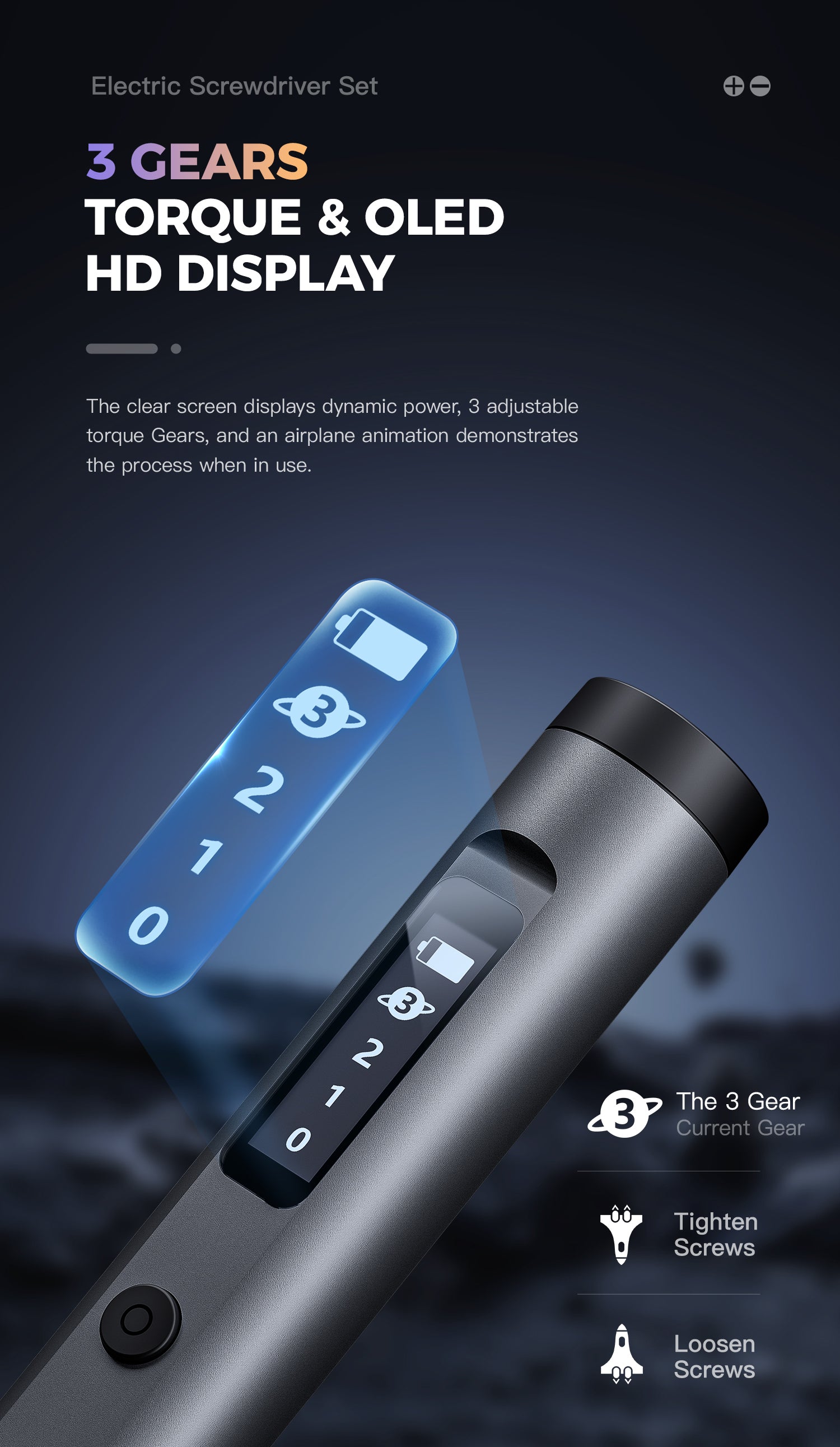 - 3 gears, torque & OLED HD display. The clear screen displays dynamic power, 3 adjustable torque gears, and an airplane animation demonstrates the process when in use.