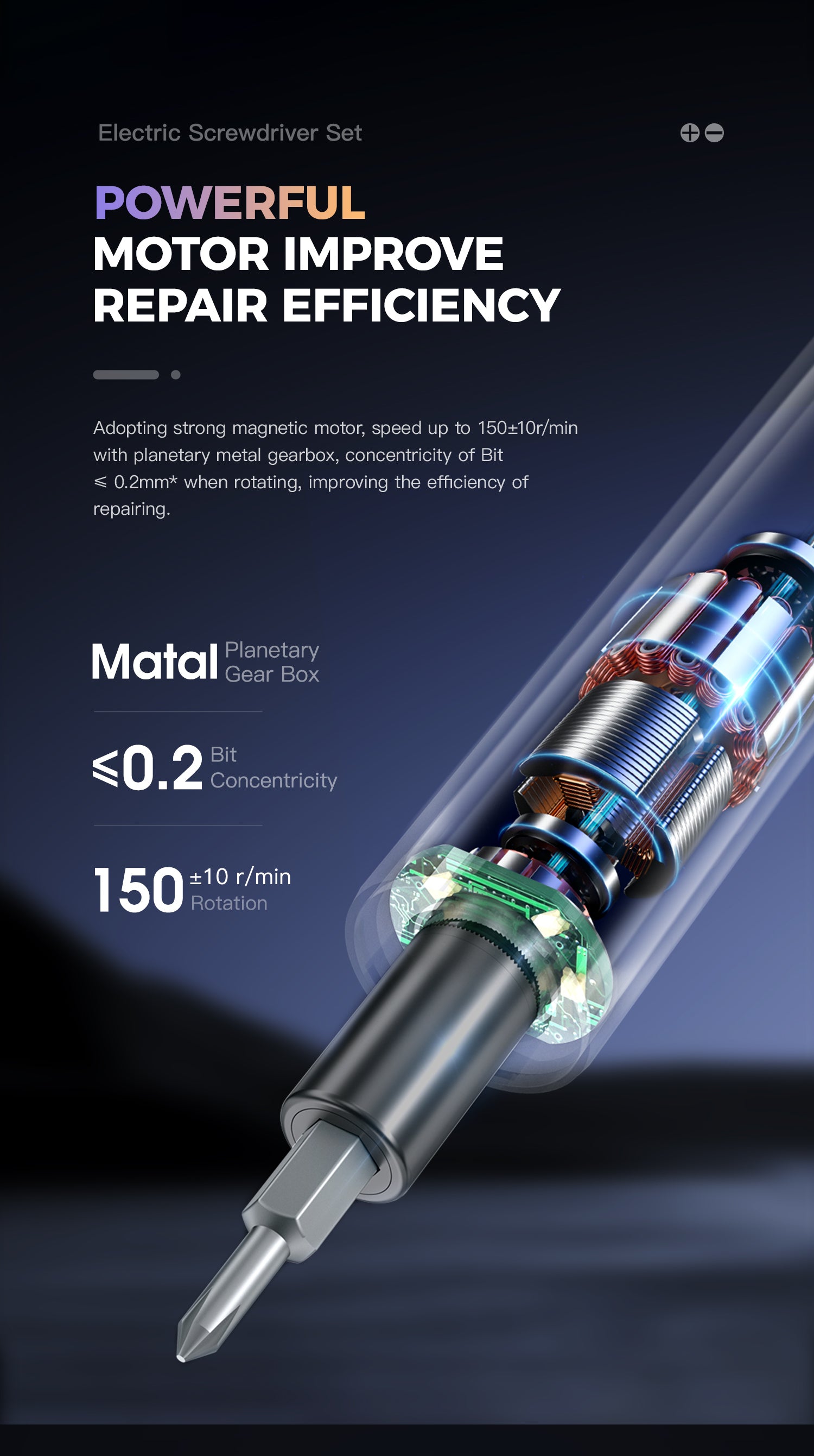 - Powerful motor improves repair efficiency. Adopting a strong magnetic motor, with a speed up to 165r/min, planetary metal gearbox, and a concentricity of 0.2mm* when rotating, it improves repair efficiency.
