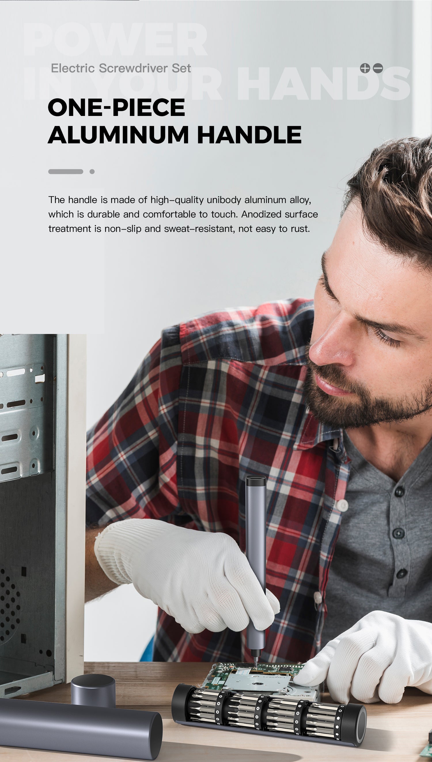 - One-piece aluminum handle. The handle is made of high-quality unibody aluminum alloy, which is durable and comfortable to touch. Anodised surface treatment is non-slip and sweat-resistant, not easily rusted.