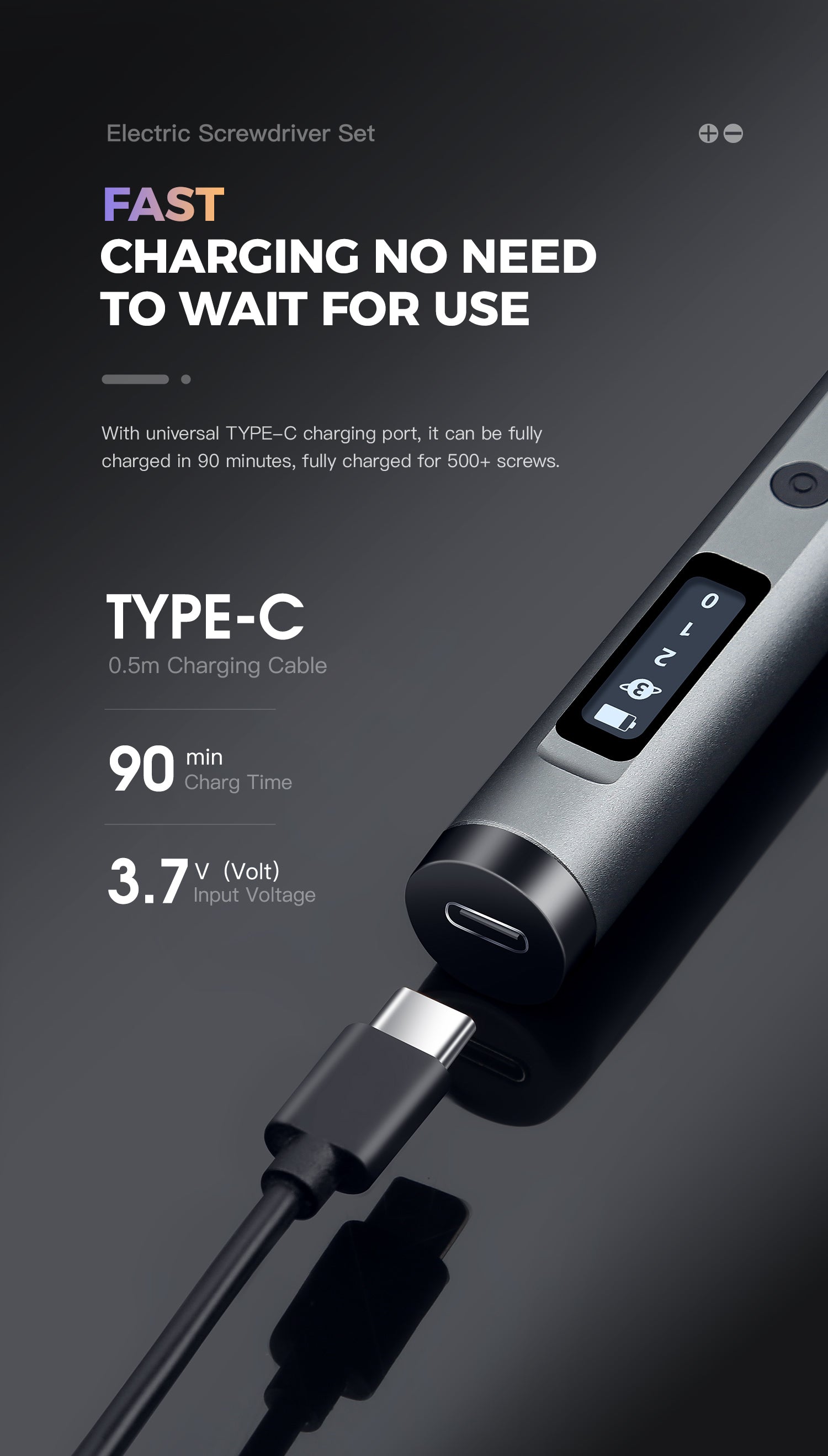 - Fast charging, no need to wait for use. With a universal type-c charging port, it can be fully charged in 90 minutes, fully charged for 500+ screws.